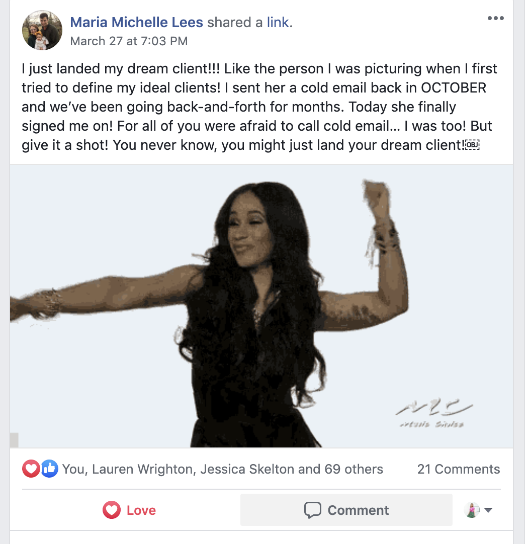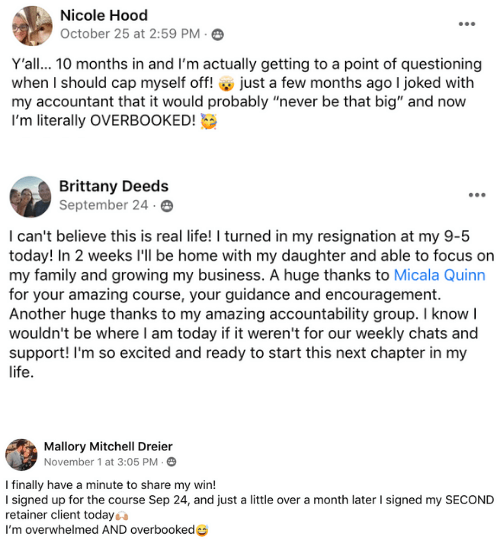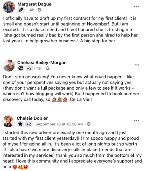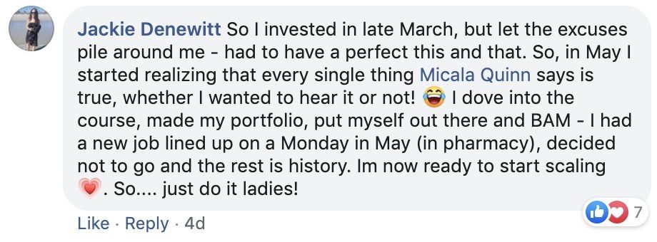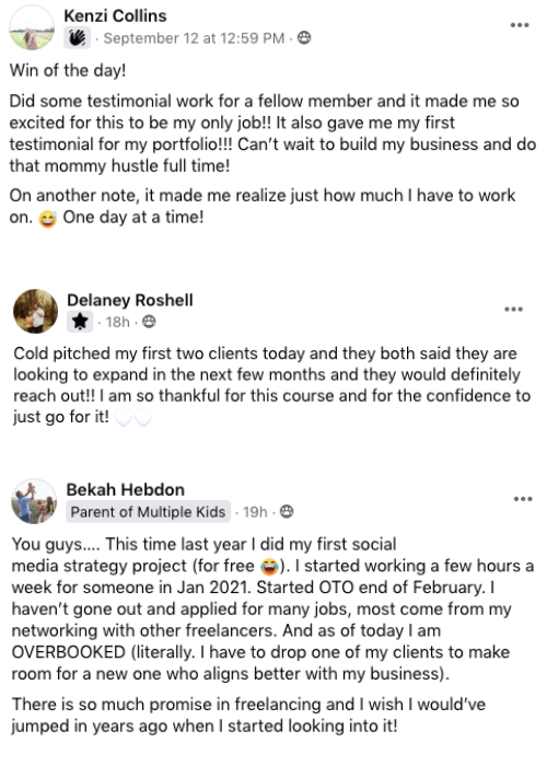 In addition to the trainings, templates, weekly live coaching calls, monthly challenges, job leads, and student community connection you can instantly access, I am always here if you need additional 1:1 support.
